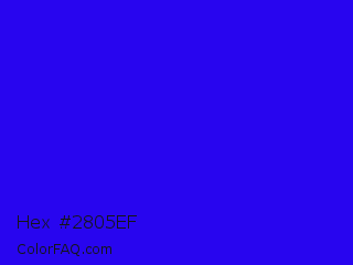 Hex #2805ef Color is a normal indigo color and the nearest color is Bluebonnet #1c1cf0. Hex code #2805ef and RGB value is rgb(40,5,239). In RGB color space, this color is composed of 16% red, 2% green, 94% blue, In CMYK color space, this color is composed of 83% cyan, 98% magenta, 0% yellow , 6% black , In HSL color space, this color has a hue angle of 249° , 96% saturation and 48% lightness.