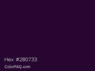 Hex #280733 Color is a very dark purple color and the nearest color is Jacaranda #2e0329. Hex code #280733 and RGB value is rgb(40,7,51). In RGB color space, this color is composed of 16% red, 3% green, 20% blue, In CMYK color space, this color is composed of 22% cyan, 86% magenta, 0% yellow , 80% black , In HSL color space, this color has a hue angle of 285° , 76% saturation and 11% lightness.