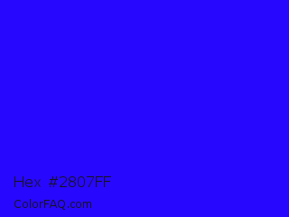 Hex #2807ff Color is a normal indigo color and the nearest color is Electric Ultramarine #3f00ff. Hex code #2807ff and RGB value is rgb(40,7,255). In RGB color space, this color is composed of 16% red, 3% green, 100% blue, In CMYK color space, this color is composed of 84% cyan, 97% magenta, 0% yellow , 0% black , In HSL color space, this color has a hue angle of 248° , 100% saturation and 51% lightness.