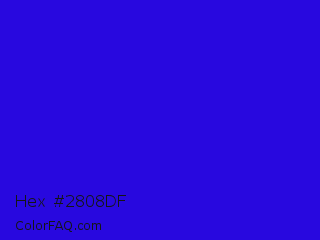 Hex #2808df Color is a normal indigo color and the nearest color is Interdimensional Blue #360ccc. Hex code #2808df and RGB value is rgb(40,8,223). In RGB color space, this color is composed of 16% red, 3% green, 87% blue, In CMYK color space, this color is composed of 82% cyan, 96% magenta, 0% yellow , 13% black , In HSL color space, this color has a hue angle of 249° , 93% saturation and 45% lightness.