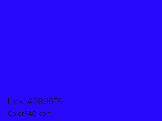 Hex #2808f9 Color is a normal indigo color and the nearest color is Bluebonnet #1c1cf0. Hex code #2808f9 and RGB value is rgb(40,8,249). In RGB color space, this color is composed of 16% red, 3% green, 98% blue, In CMYK color space, this color is composed of 84% cyan, 97% magenta, 0% yellow , 2% black , In HSL color space, this color has a hue angle of 248° , 95% saturation and 50% lightness.