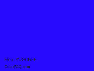 Hex #280bff Color is a normal indigo color and the nearest color is Electric Ultramarine #3f00ff. Hex code #280bff and RGB value is rgb(40,11,255). In RGB color space, this color is composed of 16% red, 4% green, 100% blue, In CMYK color space, this color is composed of 84% cyan, 96% magenta, 0% yellow , 0% black , In HSL color space, this color has a hue angle of 247° , 100% saturation and 52% lightness.