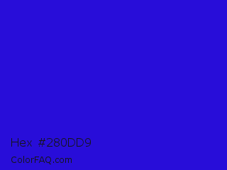 Hex #280dd9 Color is a normal indigo color and the nearest color is Interdimensional Blue #360ccc. Hex code #280dd9 and RGB value is rgb(40,13,217). In RGB color space, this color is composed of 16% red, 5% green, 85% blue, In CMYK color space, this color is composed of 82% cyan, 94% magenta, 0% yellow , 15% black , In HSL color space, this color has a hue angle of 248° , 89% saturation and 45% lightness.