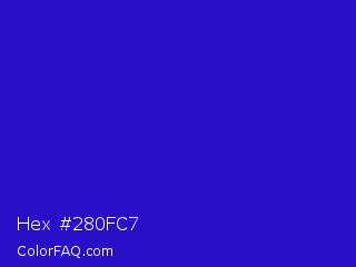 Hex #280fc7 Color is a normal indigo color and the nearest color is Interdimensional Blue #360ccc. Hex code #280fc7 and RGB value is rgb(40,15,199). In RGB color space, this color is composed of 16% red, 6% green, 78% blue, In CMYK color space, this color is composed of 80% cyan, 92% magenta, 0% yellow , 22% black , In HSL color space, this color has a hue angle of 248° , 86% saturation and 42% lightness.