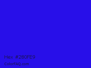 Hex #280fe9 Color is a normal indigo color and the nearest color is Bluebonnet #1c1cf0. Hex code #280fe9 and RGB value is rgb(40,15,233). In RGB color space, this color is composed of 16% red, 6% green, 91% blue, In CMYK color space, this color is composed of 83% cyan, 94% magenta, 0% yellow , 9% black , In HSL color space, this color has a hue angle of 247° , 88% saturation and 49% lightness.