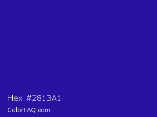 Hex #2813a1 Color is a normal indigo color and the nearest color is Blue Gem #2c0e8c. Hex code #2813a1 and RGB value is rgb(40,19,161). In RGB color space, this color is composed of 16% red, 7% green, 63% blue, In CMYK color space, this color is composed of 75% cyan, 88% magenta, 0% yellow , 37% black , In HSL color space, this color has a hue angle of 249° , 79% saturation and 35% lightness.