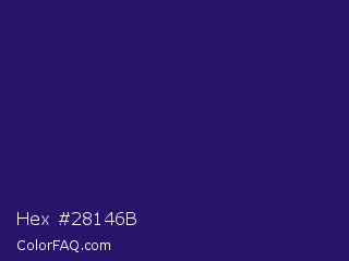 Hex #28146b Color is a dark indigo color and the nearest color is Paris M #26056a. Hex code #28146b and RGB value is rgb(40,20,107). In RGB color space, this color is composed of 16% red, 8% green, 42% blue, In CMYK color space, this color is composed of 63% cyan, 81% magenta, 0% yellow , 58% black , In HSL color space, this color has a hue angle of 254° , 69% saturation and 25% lightness.