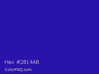 Hex #2814ab Color is a normal indigo color and the nearest color is Blue Gem #2c0e8c. Hex code #2814ab and RGB value is rgb(40,20,171). In RGB color space, this color is composed of 16% red, 8% green, 67% blue, In CMYK color space, this color is composed of 77% cyan, 88% magenta, 0% yellow , 33% black , In HSL color space, this color has a hue angle of 248° , 79% saturation and 37% lightness.