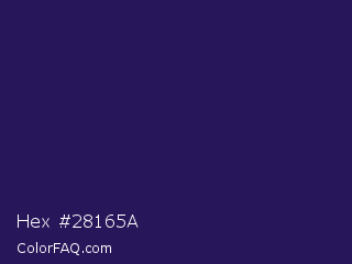 Hex #28165a Color is a very dark indigo color and the nearest color is Violent Violet #290c5e. Hex code #28165a and RGB value is rgb(40,22,90). In RGB color space, this color is composed of 16% red, 9% green, 35% blue, In CMYK color space, this color is composed of 56% cyan, 76% magenta, 0% yellow , 65% black , In HSL color space, this color has a hue angle of 256° , 61% saturation and 22% lightness.