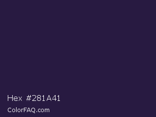Hex #281a41 Color is a very dark violet color and the nearest color is Valhalla #2b194f. Hex code #281a41 and RGB value is rgb(40,26,65). In RGB color space, this color is composed of 16% red, 10% green, 25% blue, In CMYK color space, this color is composed of 38% cyan, 60% magenta, 0% yellow , 75% black , In HSL color space, this color has a hue angle of 262° , 43% saturation and 18% lightness.