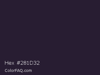 Hex #281d32 Color is a very dark purple color and the nearest color is Bastille #292130. Hex code #281d32 and RGB value is rgb(40,29,50). In RGB color space, this color is composed of 16% red, 11% green, 20% blue, In CMYK color space, this color is composed of 20% cyan, 42% magenta, 0% yellow , 80% black , In HSL color space, this color has a hue angle of 271° , 27% saturation and 15% lightness.