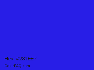 Hex #281ee7 Color is a normal indigo color and the nearest color is Bluebonnet #1c1cf0. Hex code #281ee7 and RGB value is rgb(40,30,231). In RGB color space, this color is composed of 16% red, 12% green, 91% blue, In CMYK color space, this color is composed of 83% cyan, 87% magenta, 0% yellow , 9% black , In HSL color space, this color has a hue angle of 243° , 81% saturation and 51% lightness.