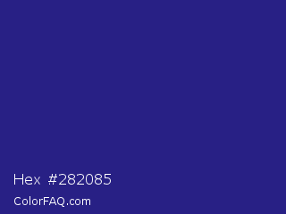 Hex #282085 Color is a normal indigo color and the nearest color is Jacksons Purple #20208d. Hex code #282085 and RGB value is rgb(40,32,133). In RGB color space, this color is composed of 16% red, 13% green, 52% blue, In CMYK color space, this color is composed of 70% cyan, 76% magenta, 0% yellow , 48% black , In HSL color space, this color has a hue angle of 245° , 61% saturation and 32% lightness.