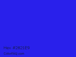 Hex #2821e9 Color is a normal indigo color and the nearest color is Bluebonnet #1c1cf0. Hex code #2821e9 and RGB value is rgb(40,33,233). In RGB color space, this color is composed of 16% red, 13% green, 91% blue, In CMYK color space, this color is composed of 83% cyan, 86% magenta, 0% yellow , 9% black , In HSL color space, this color has a hue angle of 242° , 82% saturation and 52% lightness.