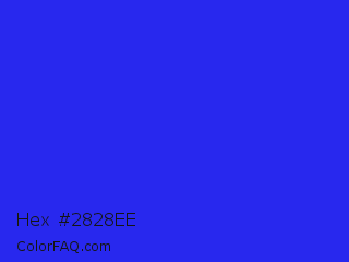 Hex #2828ee Color is a normal blue color and the nearest color is Bluebonnet #1c1cf0. Hex code #2828ee and RGB value is rgb(40,40,238). In RGB color space, this color is composed of 16% red, 16% green, 93% blue, In CMYK color space, this color is composed of 83% cyan, 83% magenta, 0% yellow , 7% black , In HSL color space, this color has a hue angle of 240° , 85% saturation and 55% lightness.