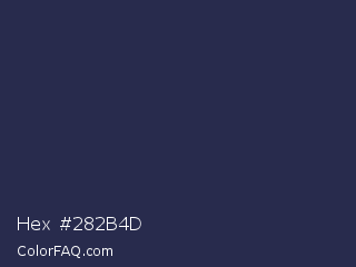 Hex #282b4d Color is a dark blue color and the nearest color is Cloud Burst #202e54. Hex code #282b4d and RGB value is rgb(40,43,77). In RGB color space, this color is composed of 16% red, 17% green, 30% blue, In CMYK color space, this color is composed of 48% cyan, 44% magenta, 0% yellow , 70% black , In HSL color space, this color has a hue angle of 235° , 32% saturation and 23% lightness.