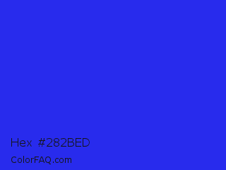 Hex #282bed Color is a normal blue color and the nearest color is Palatinate Blue #273be2. Hex code #282bed and RGB value is rgb(40,43,237). In RGB color space, this color is composed of 16% red, 17% green, 93% blue, In CMYK color space, this color is composed of 83% cyan, 82% magenta, 0% yellow , 7% black , In HSL color space, this color has a hue angle of 239° , 85% saturation and 54% lightness.