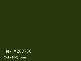 Hex #28370c Color is a very dark green color and the nearest color is Turtle Green #2a380b. Hex code #28370c and RGB value is rgb(40,55,12). In RGB color space, this color is composed of 16% red, 22% green, 5% blue, In CMYK color space, this color is composed of 27% cyan, 0% magenta, 78% yellow , 78% black , In HSL color space, this color has a hue angle of 81° , 64% saturation and 13% lightness.