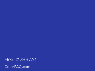 Hex #2837a1 Color is a normal blue color and the nearest color is Blue Pigment #333399. Hex code #2837a1 and RGB value is rgb(40,55,161). In RGB color space, this color is composed of 16% red, 22% green, 63% blue, In CMYK color space, this color is composed of 75% cyan, 66% magenta, 0% yellow , 37% black , In HSL color space, this color has a hue angle of 233° , 60% saturation and 39% lightness.