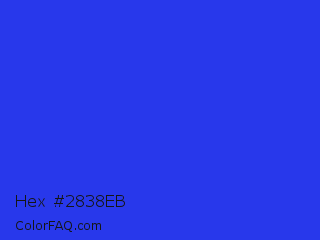 Hex #2838eb Color is a normal blue color and the nearest color is Palatinate Blue #273be2. Hex code #2838eb and RGB value is rgb(40,56,235). In RGB color space, this color is composed of 16% red, 22% green, 92% blue, In CMYK color space, this color is composed of 83% cyan, 76% magenta, 0% yellow , 8% black , In HSL color space, this color has a hue angle of 235° , 83% saturation and 54% lightness.