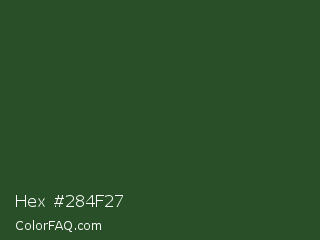 Hex #284f27 Color is a dark green color and the nearest color is Cal Poly Pomona Green #1e4d2b. Hex code #284f27 and RGB value is rgb(40,79,39). In RGB color space, this color is composed of 16% red, 31% green, 15% blue, In CMYK color space, this color is composed of 49% cyan, 0% magenta, 51% yellow , 69% black , In HSL color space, this color has a hue angle of 119° , 34% saturation and 23% lightness.