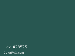 Hex #285751 Color is a dark cyan color and the nearest color is Plantation #27504b. Hex code #285751 and RGB value is rgb(40,87,81). In RGB color space, this color is composed of 16% red, 34% green, 32% blue, In CMYK color space, this color is composed of 54% cyan, 0% magenta, 7% yellow , 66% black , In HSL color space, this color has a hue angle of 172° , 37% saturation and 25% lightness.