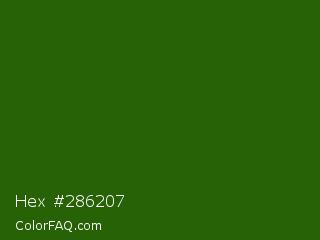 Hex #286207 Color is a very dark green color and the nearest color is Lincoln Green #195905. Hex code #286207 and RGB value is rgb(40,98,7). In RGB color space, this color is composed of 16% red, 38% green, 3% blue, In CMYK color space, this color is composed of 59% cyan, 0% magenta, 93% yellow , 62% black , In HSL color space, this color has a hue angle of 98° , 87% saturation and 21% lightness.