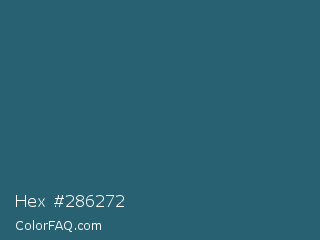 Hex #286272 Color is a dark cyan color and the nearest color is Casal #2f6168. Hex code #286272 and RGB value is rgb(40,98,114). In RGB color space, this color is composed of 16% red, 38% green, 45% blue, In CMYK color space, this color is composed of 65% cyan, 14% magenta, 0% yellow , 55% black , In HSL color space, this color has a hue angle of 193° , 48% saturation and 30% lightness.