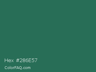 Hex #286e57 Color is a dark green color and the nearest color is Stromboli #325d52. Hex code #286e57 and RGB value is rgb(40,110,87). In RGB color space, this color is composed of 16% red, 43% green, 34% blue, In CMYK color space, this color is composed of 64% cyan, 0% magenta, 21% yellow , 57% black , In HSL color space, this color has a hue angle of 160° , 47% saturation and 29% lightness.