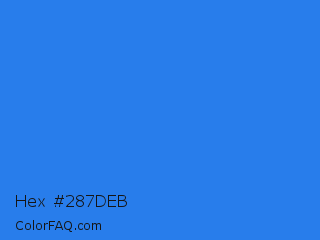 Hex #287deb Color is a normal blue color and the nearest color is Bleu De France #318ce7. Hex code #287deb and RGB value is rgb(40,125,235). In RGB color space, this color is composed of 16% red, 49% green, 92% blue, In CMYK color space, this color is composed of 83% cyan, 47% magenta, 0% yellow , 8% black , In HSL color space, this color has a hue angle of 214° , 83% saturation and 54% lightness.