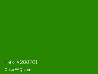 Hex #288701 Color is a dark green color and the nearest color is Napier Green #2a8000. Hex code #288701 and RGB value is rgb(40,135,1). In RGB color space, this color is composed of 16% red, 53% green, 0% blue, In CMYK color space, this color is composed of 70% cyan, 0% magenta, 99% yellow , 47% black , In HSL color space, this color has a hue angle of 103° , 99% saturation and 27% lightness.