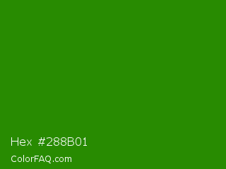 Hex #288b01 Color is a dark green color and the nearest color is Napier Green #2a8000. Hex code #288b01 and RGB value is rgb(40,139,1). In RGB color space, this color is composed of 16% red, 55% green, 0% blue, In CMYK color space, this color is composed of 71% cyan, 0% magenta, 99% yellow , 45% black , In HSL color space, this color has a hue angle of 103° , 99% saturation and 27% lightness.
