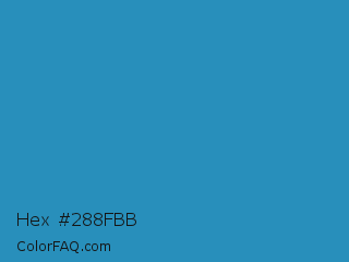 Hex #288fbb Color is a normal blue color and the nearest color is Cyan Cornflower Blue #188bc2. Hex code #288fbb and RGB value is rgb(40,143,187). In RGB color space, this color is composed of 16% red, 56% green, 73% blue, In CMYK color space, this color is composed of 79% cyan, 24% magenta, 0% yellow , 27% black , In HSL color space, this color has a hue angle of 198° , 65% saturation and 45% lightness.