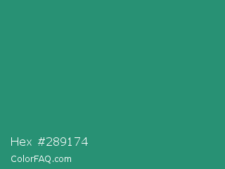 Hex #289174 Color is a normal green color and the nearest color is Illuminating Emerald #319177. Hex code #289174 and RGB value is rgb(40,145,116). In RGB color space, this color is composed of 16% red, 57% green, 45% blue, In CMYK color space, this color is composed of 72% cyan, 0% magenta, 20% yellow , 43% black , In HSL color space, this color has a hue angle of 163° , 57% saturation and 36% lightness.