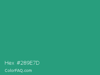 Hex #289e7d Color is a normal green color and the nearest color is Jungle Green #29ab87. Hex code #289e7d and RGB value is rgb(40,158,125). In RGB color space, this color is composed of 16% red, 62% green, 49% blue, In CMYK color space, this color is composed of 75% cyan, 0% magenta, 21% yellow , 38% black , In HSL color space, this color has a hue angle of 163° , 60% saturation and 39% lightness.