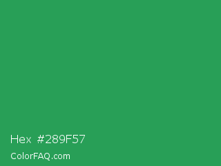 Hex #289f57 Color is a normal green color and the nearest color is Sea Green #2e8b57. Hex code #289f57 and RGB value is rgb(40,159,87). In RGB color space, this color is composed of 16% red, 62% green, 34% blue, In CMYK color space, this color is composed of 75% cyan, 0% magenta, 45% yellow , 38% black , In HSL color space, this color has a hue angle of 144° , 60% saturation and 39% lightness.