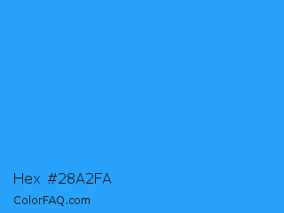 Hex #28a2fa Color is a normal blue color and the nearest color is Button Blue #24a0ed. Hex code #28a2fa and RGB value is rgb(40,162,250). In RGB color space, this color is composed of 16% red, 64% green, 98% blue, In CMYK color space, this color is composed of 84% cyan, 35% magenta, 0% yellow , 2% black , In HSL color space, this color has a hue angle of 205° , 95% saturation and 57% lightness.