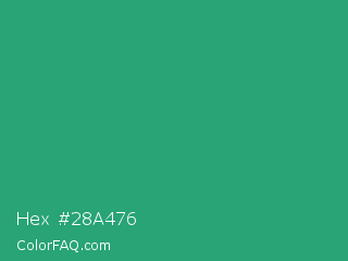 Hex #28a476 Color is a normal green color and the nearest color is Green Crayola #1cac78. Hex code #28a476 and RGB value is rgb(40,164,118). In RGB color space, this color is composed of 16% red, 64% green, 46% blue, In CMYK color space, this color is composed of 76% cyan, 0% magenta, 28% yellow , 36% black , In HSL color space, this color has a hue angle of 158° , 61% saturation and 40% lightness.