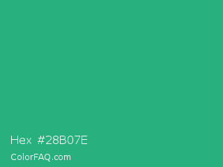 Hex #28b07e Color is a normal green color and the nearest color is Jungle Green #29ab87. Hex code #28b07e and RGB value is rgb(40,176,126). In RGB color space, this color is composed of 16% red, 69% green, 49% blue, In CMYK color space, this color is composed of 77% cyan, 0% magenta, 28% yellow , 31% black , In HSL color space, this color has a hue angle of 158° , 63% saturation and 42% lightness.