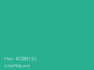 Hex #28b191 Color is a normal cyan color and the nearest color is Jungle Green #29ab87. Hex code #28b191 and RGB value is rgb(40,177,145). In RGB color space, this color is composed of 16% red, 69% green, 57% blue, In CMYK color space, this color is composed of 77% cyan, 0% magenta, 18% yellow , 31% black , In HSL color space, this color has a hue angle of 166° , 63% saturation and 43% lightness.