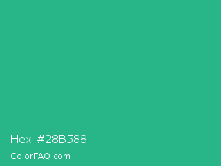 Hex #28b588 Color is a normal green color and the nearest color is Jungle Green #29ab87. Hex code #28b588 and RGB value is rgb(40,181,136). In RGB color space, this color is composed of 16% red, 71% green, 53% blue, In CMYK color space, this color is composed of 78% cyan, 0% magenta, 25% yellow , 29% black , In HSL color space, this color has a hue angle of 161° , 64% saturation and 43% lightness.
