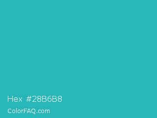 Hex #28b6b8 Color is a normal cyan color and the nearest color is Maximum Blue Green #30bfbf. Hex code #28b6b8 and RGB value is rgb(40,182,184). In RGB color space, this color is composed of 16% red, 71% green, 72% blue, In CMYK color space, this color is composed of 78% cyan, 1% magenta, 0% yellow , 28% black , In HSL color space, this color has a hue angle of 181° , 64% saturation and 44% lightness.