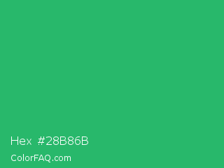 Hex #28b86b Color is a normal green color and the nearest color is Green Crayola #1cac78. Hex code #28b86b and RGB value is rgb(40,184,107). In RGB color space, this color is composed of 16% red, 72% green, 42% blue, In CMYK color space, this color is composed of 78% cyan, 0% magenta, 42% yellow , 28% black , In HSL color space, this color has a hue angle of 148° , 64% saturation and 44% lightness.