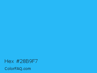 Hex #28b9f7 Color is a normal blue color and the nearest color is Spiro Disco Ball #0fc0fc. Hex code #28b9f7 and RGB value is rgb(40,185,247). In RGB color space, this color is composed of 16% red, 73% green, 97% blue, In CMYK color space, this color is composed of 84% cyan, 25% magenta, 0% yellow , 3% black , In HSL color space, this color has a hue angle of 198° , 93% saturation and 56% lightness.