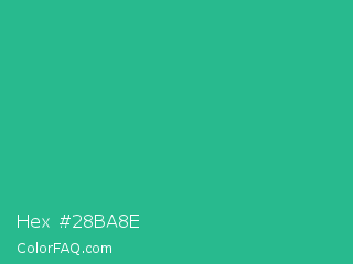 Hex #28ba8e Color is a normal green color and the nearest color is Mountain Meadow #30ba8f. Hex code #28ba8e and RGB value is rgb(40,186,142). In RGB color space, this color is composed of 16% red, 73% green, 56% blue, In CMYK color space, this color is composed of 78% cyan, 0% magenta, 24% yellow , 27% black , In HSL color space, this color has a hue angle of 162° , 65% saturation and 44% lightness.