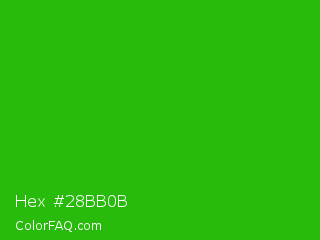 Hex #28bb0b Color is a normal green color and the nearest color is Harlequin Green #46cb18. Hex code #28bb0b and RGB value is rgb(40,187,11). In RGB color space, this color is composed of 16% red, 73% green, 4% blue, In CMYK color space, this color is composed of 79% cyan, 0% magenta, 94% yellow , 27% black , In HSL color space, this color has a hue angle of 110° , 89% saturation and 39% lightness.
