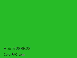 Hex #28bb28 Color is a normal green color and the nearest color is Wageningen Green #34b233. Hex code #28bb28 and RGB value is rgb(40,187,40). In RGB color space, this color is composed of 16% red, 73% green, 16% blue, In CMYK color space, this color is composed of 79% cyan, 0% magenta, 79% yellow , 27% black , In HSL color space, this color has a hue angle of 120° , 65% saturation and 45% lightness.