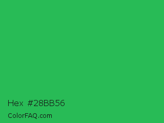 Hex #28bb56 Color is a normal green color and the nearest color is Chateau Green #40a860. Hex code #28bb56 and RGB value is rgb(40,187,86). In RGB color space, this color is composed of 16% red, 73% green, 34% blue, In CMYK color space, this color is composed of 79% cyan, 0% magenta, 54% yellow , 27% black , In HSL color space, this color has a hue angle of 139° , 65% saturation and 45% lightness.
