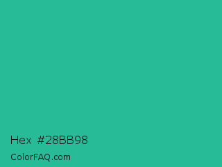 Hex #28bb98 Color is a normal cyan color and the nearest color is Mountain Meadow #30ba8f. Hex code #28bb98 and RGB value is rgb(40,187,152). In RGB color space, this color is composed of 16% red, 73% green, 60% blue, In CMYK color space, this color is composed of 79% cyan, 0% magenta, 19% yellow , 27% black , In HSL color space, this color has a hue angle of 166° , 65% saturation and 45% lightness.