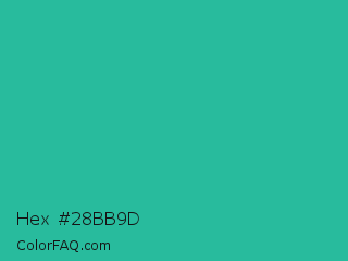 Hex #28bb9d Color is a normal cyan color and the nearest color is Mountain Meadow #30ba8f. Hex code #28bb9d and RGB value is rgb(40,187,157). In RGB color space, this color is composed of 16% red, 73% green, 62% blue, In CMYK color space, this color is composed of 79% cyan, 0% magenta, 16% yellow , 27% black , In HSL color space, this color has a hue angle of 168° , 65% saturation and 45% lightness.
